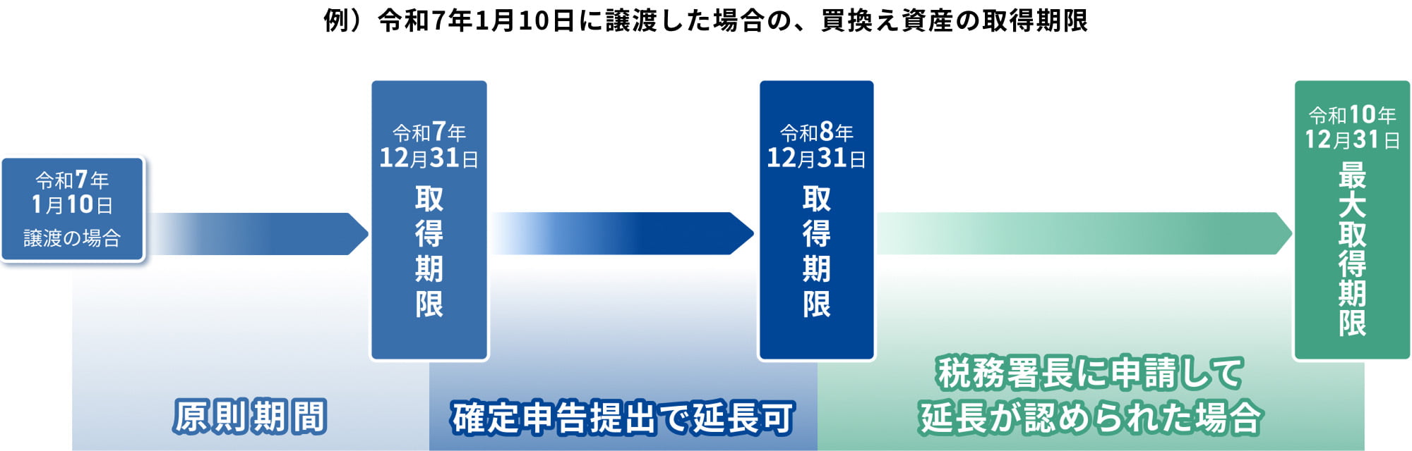 この件について、令和7年1月10日に譲渡した場合を前提にして、買換え資産の取得期限を考えてみましょう。