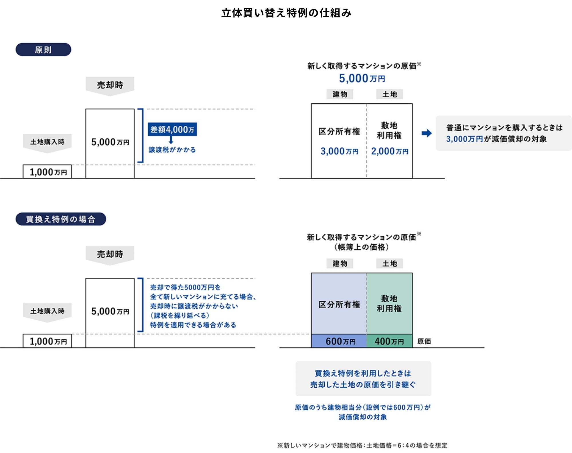 立体買換え特例の適用を受ける際の注意点の第一は、取得後の住戸等に従前の原価を引き継ぐため、将来の売却時点で譲渡税が課される点です。
