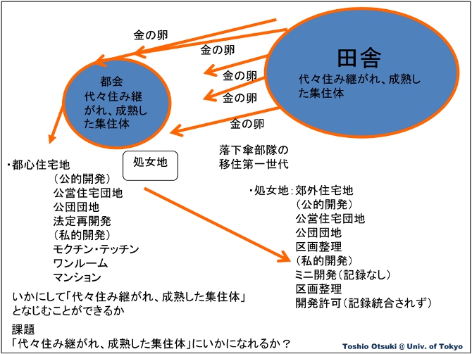 私自身は九州の農村の出身なので、昔の田舎はどんなものなのか、よく分かっているつもりですが、こういう郊外の処女地と何が違うかというと、「混ざっている」ことです。たとえば、お金持ちもいれば貧乏人もいる。金持ちの子どものほうがいろんな意味で強いわけですけど、貧乏人の子どものほうは根性があったりして、ナニクソと思ったりする。あるいは近所に障害をもった子どもがいると、お母さんとかお祖母ちゃんが、あの子と遊ぶときはこんなことに気をつけなさいと教えてくれたりする。教え方や接し方が、多少ぶっきらぼうだったりして、完璧主義的人道主義者からすると差別と糾弾されるかもしれなさそうな場面もないわけではありませんが、そういう全人格的な教育的な環境というものを、我々はどう次世代以降につくることができるかということが、本当の究極的な居住環境の形成だと思っております。