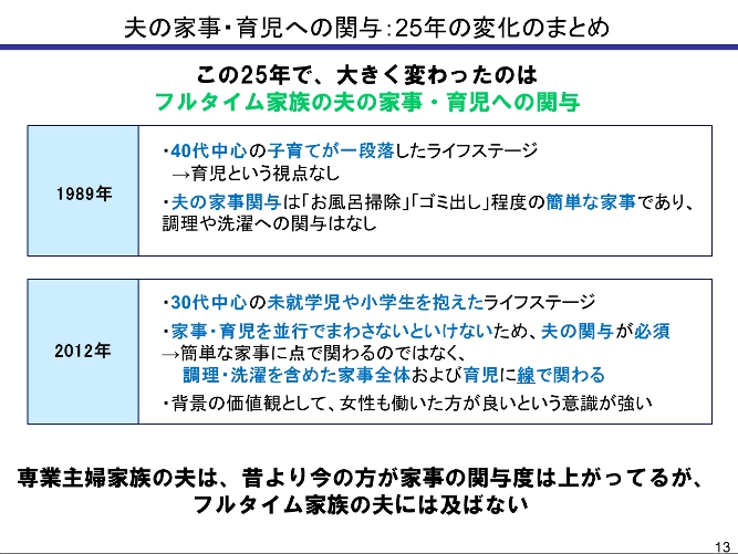 1989年には就業形態にかかわらず夫の家事への関わりが低く、風呂掃除やゴミ出しなど簡単な家事を行なっていたものが、2012年には特にフルタイムの共働き家族で、調理、洗濯、掃除のいずれも夫の関与度が高まっており、いわば点から線へ、夫の家事関与が進んでいるという結果でした。