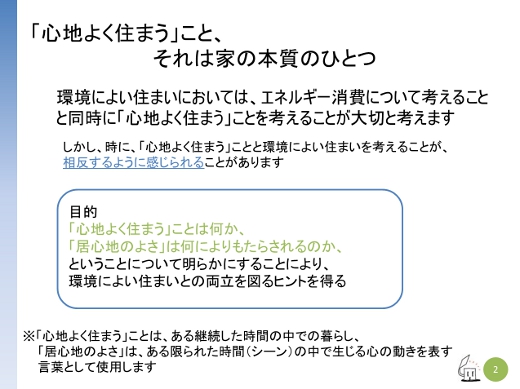 心地よく住まう」こととは何か、そして「居心地のよさ」は何によりもたらされるのかを明らかにする研究についてご報告いたします。