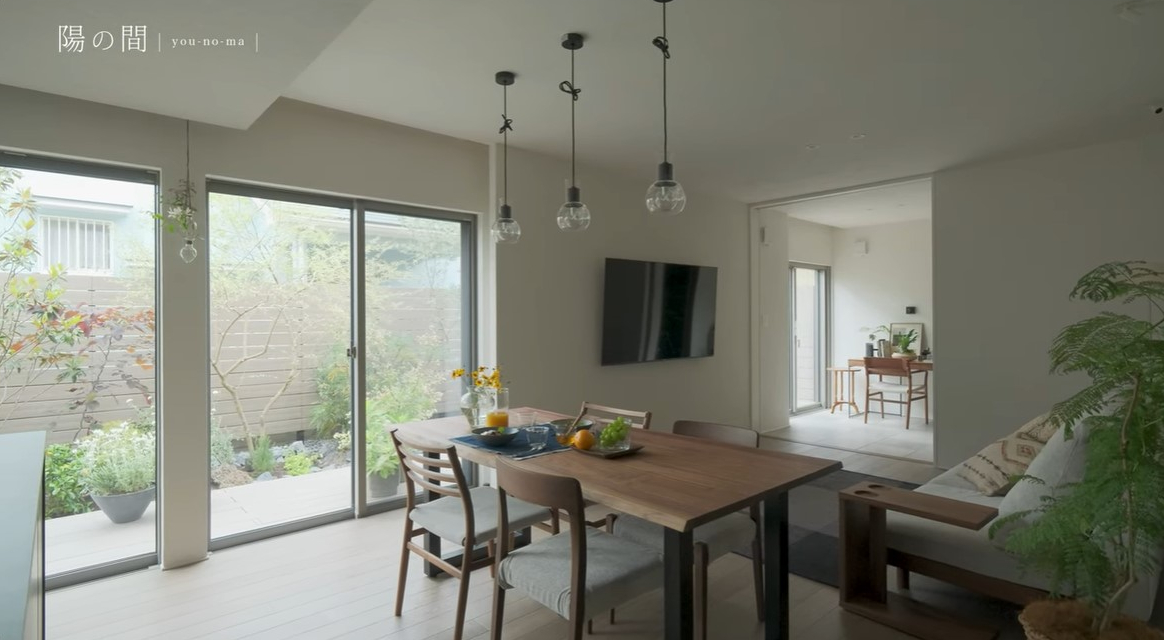 陽の間:ワイドピクチャーウィンドウが、光をたっぷりと室内に取り込みます。ノイズの少ない大きなガラスを使うことで、室内にいても空や緑などの景色を視覚的に味わえる、開放感のある空間になります。