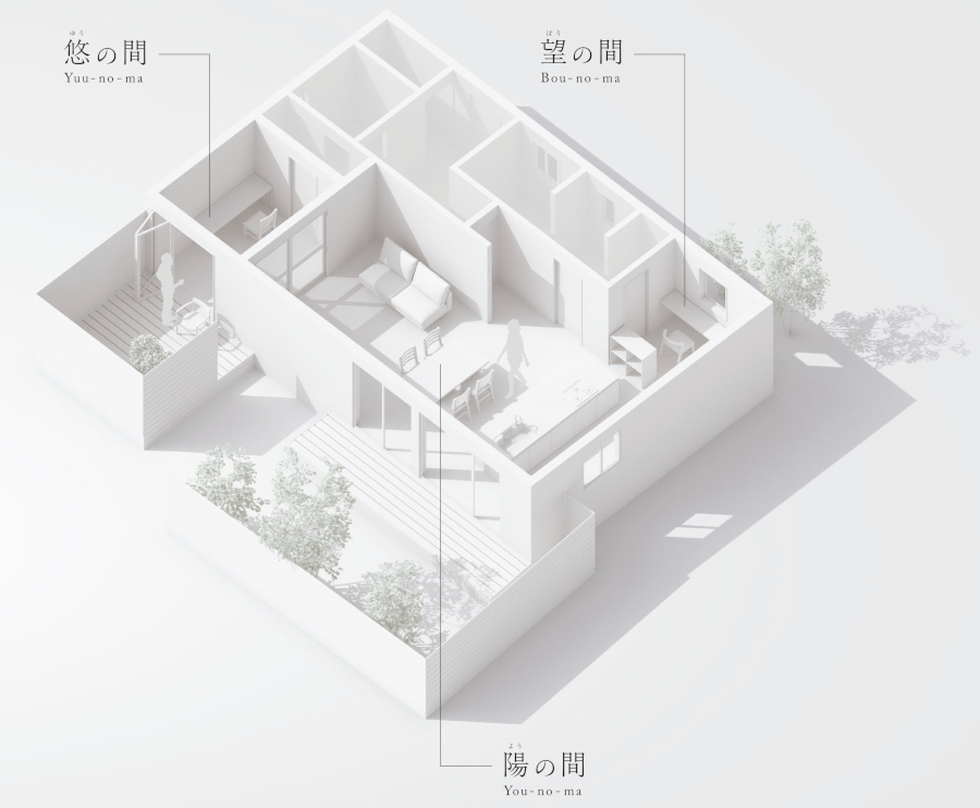 その時の気分や生活のシーンに合わせた3つの居場所「悠(ゆう)の間」「望(ぼう)の間」「陽(よう)の間」という〈空間〉を設けることで、心ほどける開放感と、包まれるような安心感を感じられる暮らしを提案しています。