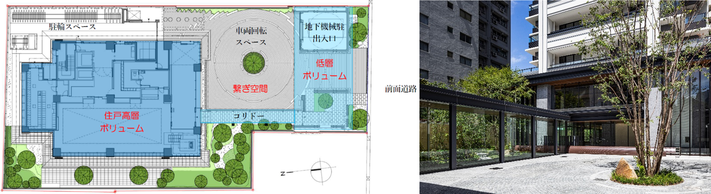 左:動線上のアイストップとなる植栽配置(道路面より)